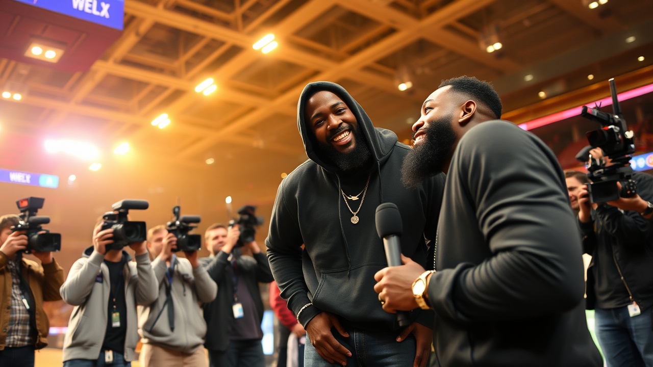 Following the game, Harden participated in his first postgame interview with reporter Serena Winters. The moment became unforgettable when famed rapper Travis Scott unexpectedly joined the scene.